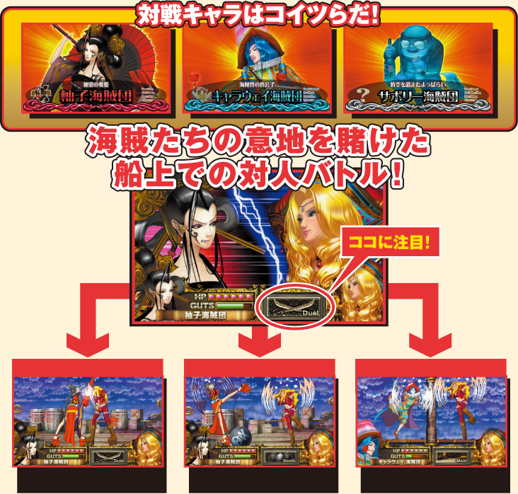 2ゲーム間続く、液晶横の海賊船役モノと連動した迫力満点のバトル演出