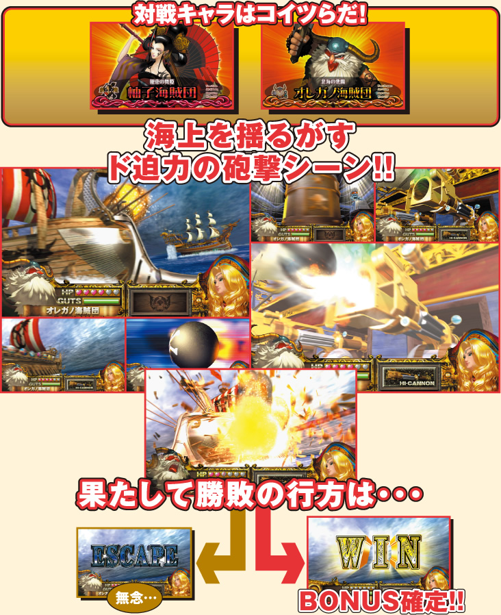 2ゲーム間続く、液晶横の海賊船役モノと連動した迫力満点のバトル演出