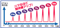 BIG終了および天井到達時、次の天井到達(=ET突入)のチャンスは375〜725Gの間で8段階存在。